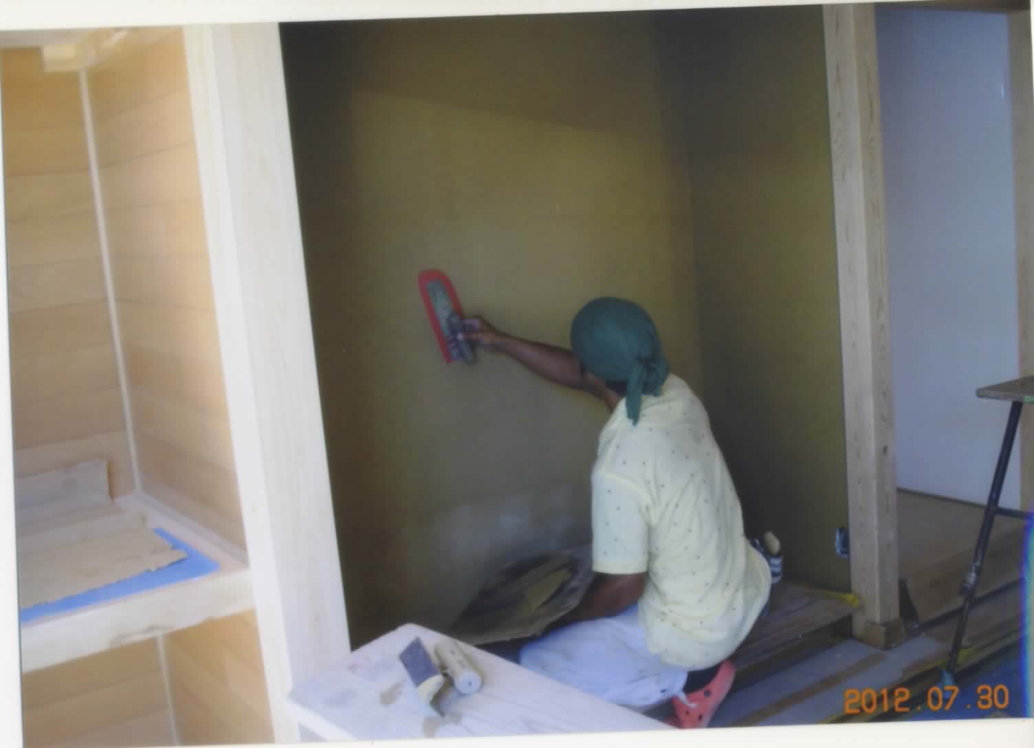 和室の壁、じゅらく、と呼ばれるものを塗っているところです。(色土、木粉、珪藻土などが配合されています) じゅらくは、塗りながらすぐ鏝波を消して、休み無く仕上げてこなければいけないのです。大壁になればすべて仕上げ終わるまで休めません。仏間は、しっくい塗りです。しっくいの基本的な仕上げは、押さえ、というもので塗った後、ちょうどよく水が引いた頃になぜて仕上がりというものです。 どちらの仕上げも下地がかなめなので、中塗りがかなめです。 壁を仕上げれるようになってくると、すごく楽しいです。そして左官仕事が面白くなってきます。 僕はそうでしたね。